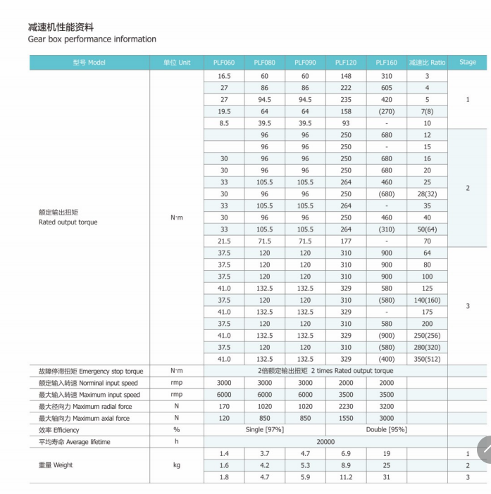 精密行星減速器PLF分別有60型號,80型號,90型號,120型號,減速比分別有L1,L2,L3段,可配各款無刷電機、伺服電機、步進電機。